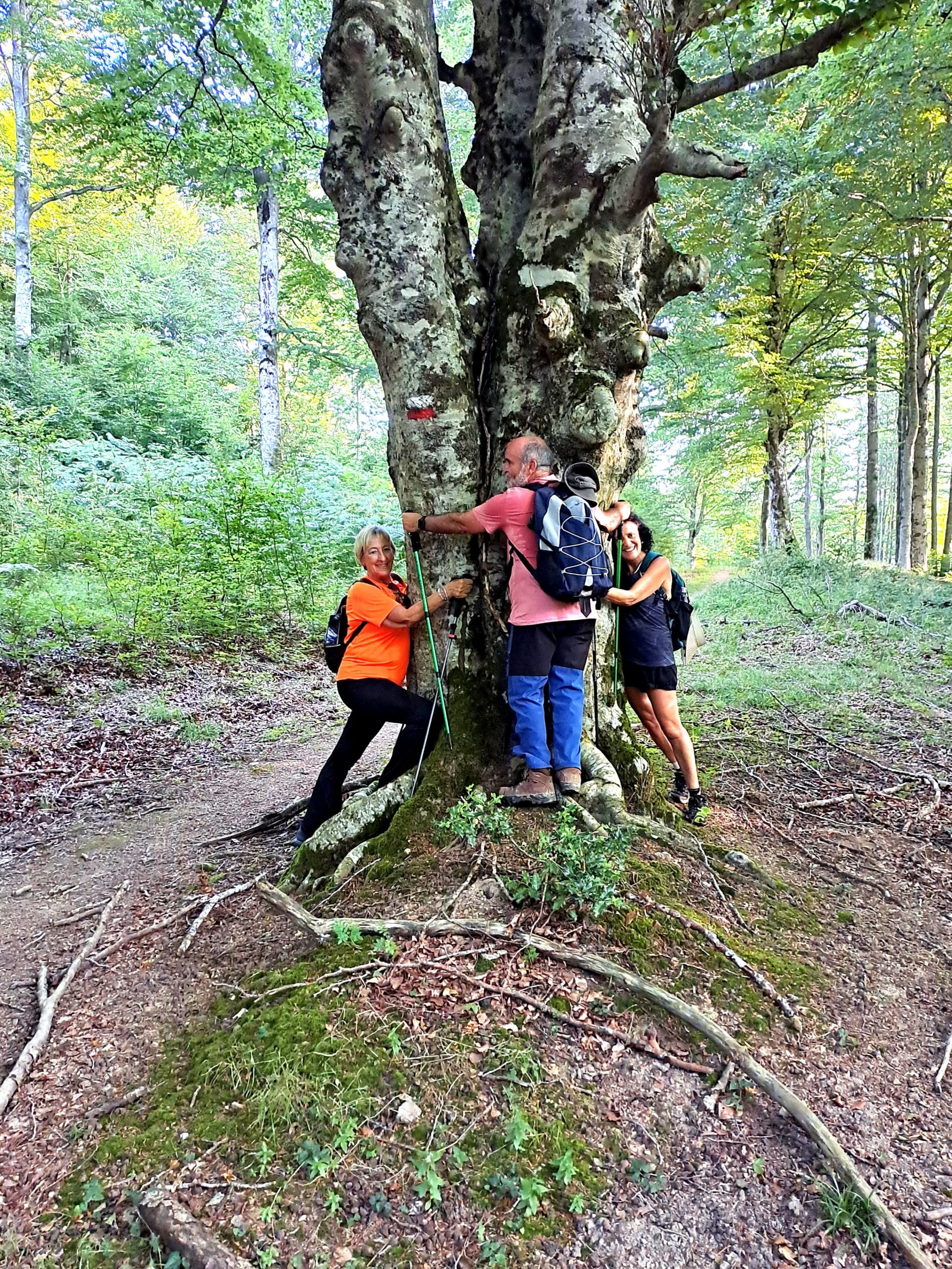 El hayedo nos ha permitido llevar a cabo una ascensión sombría y fresca, a la vez que disfrutábamos de la contemplación de hermosísimas y enormes hayas, a las que algunas y algunos no pudieron resistirse a abrazar, en un intento de absorber la energía de la madre tierra.