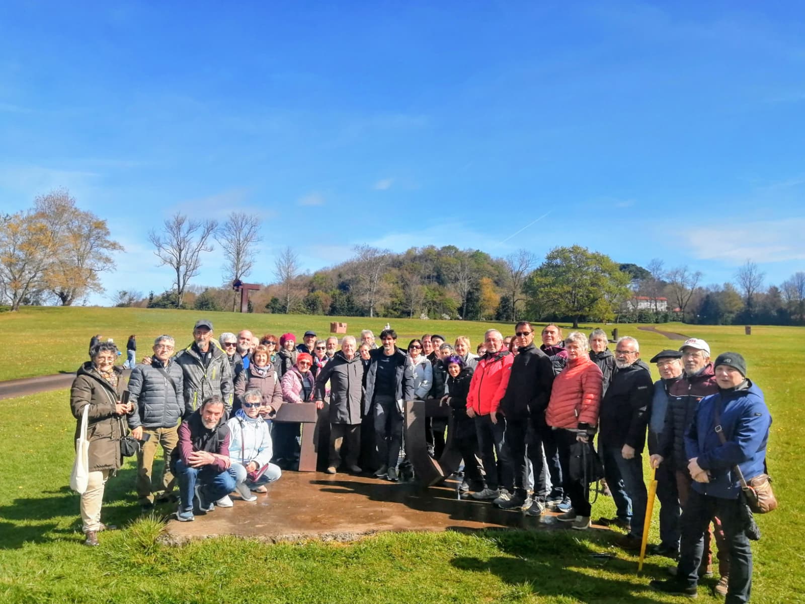 La meteorología no presagiaba nada agradable para la mañana del 26 de marzo. Viento, lluvia y frío nos acompañaron desde Lumbier hasta el barrio de Errekalde donde se ubica Txillidaleku. Esperamos temerosos la hora de comienzo de la visita refugiados en el bar, al abrigo de cafés con leche y pintxos de tortilla. Pero se obró el milagro y pudimos disfrutar de una radiante mañana soleada en las campas de Txillidaleku.